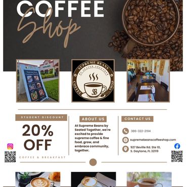 At Supreme Beans Coffee Shop by Seated Together, LLC, we are dedicated to building a cozy and inviting community where everyone feels truly connected and appreciated. We deeply value inclusion, strive to serve ethically, and enjoy sharing vibrant hospitality. We believe that great food and coffee can bring people together. That's why we created a warm and welcoming space where neighbors can come to relax, catch up with friends, and enjoy delicious, homemade food and drinks. We're more than just a coffee shop - we're a gathering place for our community. We are excited to grow and embrace this wonderful community together!